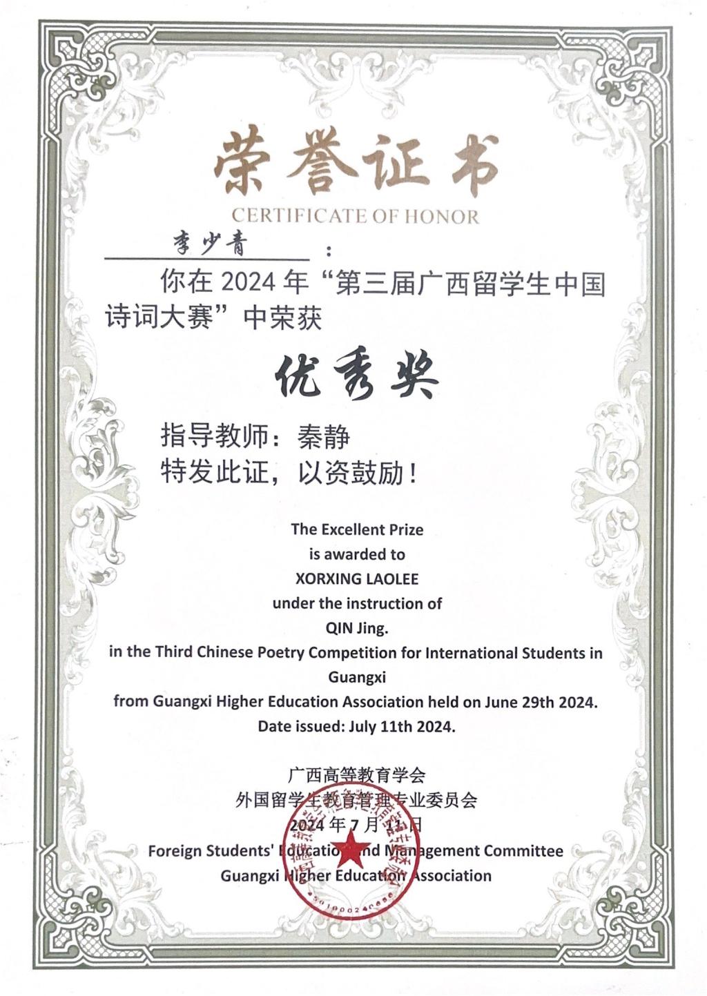 第三届广西留学生中国诗词大赛获奖
