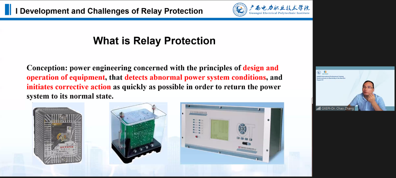 下半场培训由张超博士主讲。张超博士在广域继电保护、同步相量测量、IEC61850通信应用与测试、电力系统频率测量、智慧能源规划、主动配电网运行控制等方面研究工作卓有成效,在电气工程领域积累了大量工程研究经验。培训会上,张博士从继电保护的发展和挑战、人工智能技术的发展和优势、人工智能在继电保护中的应用三个方面,详细讲解“人工智能在继电保护中的的应用和发展”。张博士英语口语流畅,与国际学员沟通自如。
