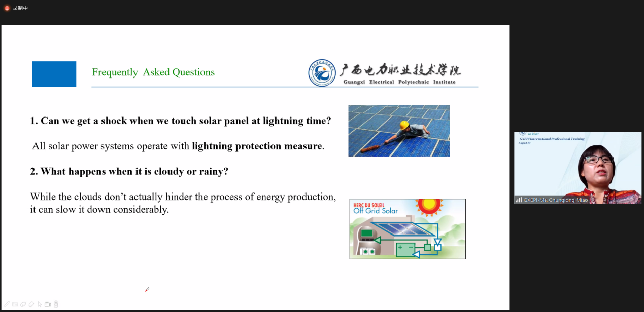 8月10日上午,我校面向东盟国际学员开展的第四期国际化专业培训顺利举办。本次培训由电力工程学院缪春琼教授和张超博士共同完成,全英文授课,主要讲授普通家庭太阳能发电系统、人工智能在继电保护中的应用和发展两大内容。150多名东盟国家学员线上学习,反映热烈。