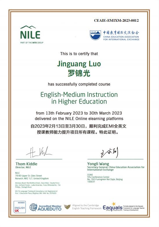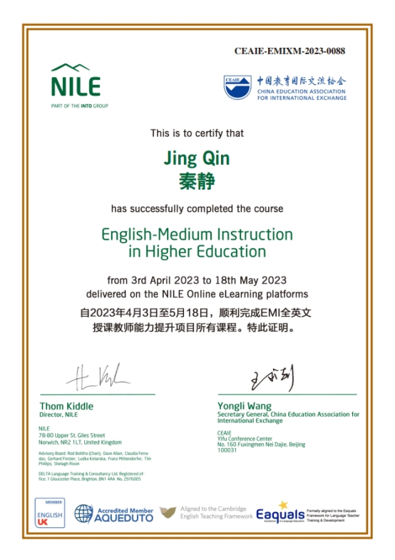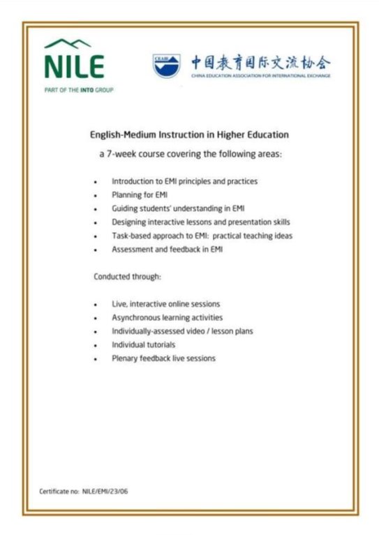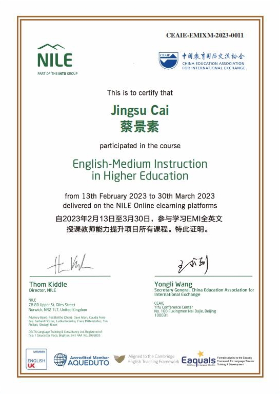 5月18日,我校5名教师参加的EMI(English Medium Instruction)全英文授课教师能力提升项目圆满结业。该培训项目由中国教育国际交流协会主办,我校黄亚璇、周丽琴、罗锦光、蔡景素、秦静等5名教师获得由中国教育国际交流协会颁发的EMI全英文授课教师能力提升项目的结业证书。