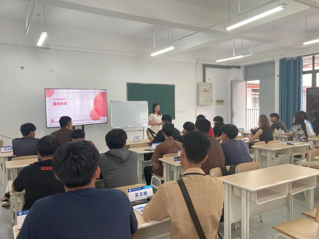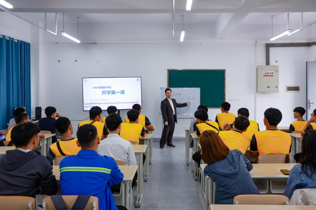 10月10日下午,学校党委副书记龙伟忠在五象校区能环楼504教室为2023级国际新生讲授“开学第一课”。