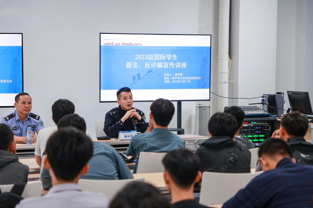 为提高国际学生遵守中国法律和防范诈骗的意识,10月11日下午,南宁市公安局龙岗派出所四级警长聂梓军受邀到学校五象校区图文信息楼822会议室为2023级国际学生开展了一场精彩而深刻的普法与防诈骗讲座。