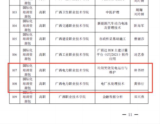 组织第二批面向东盟的国际化职业教育资源建设工作,《垃圾焚烧发电运行与维护》和《电厂水处理技术》2项国际化培训资源包获得广西壮族自治区教育厅面向东盟国际化职业教育资源认定。