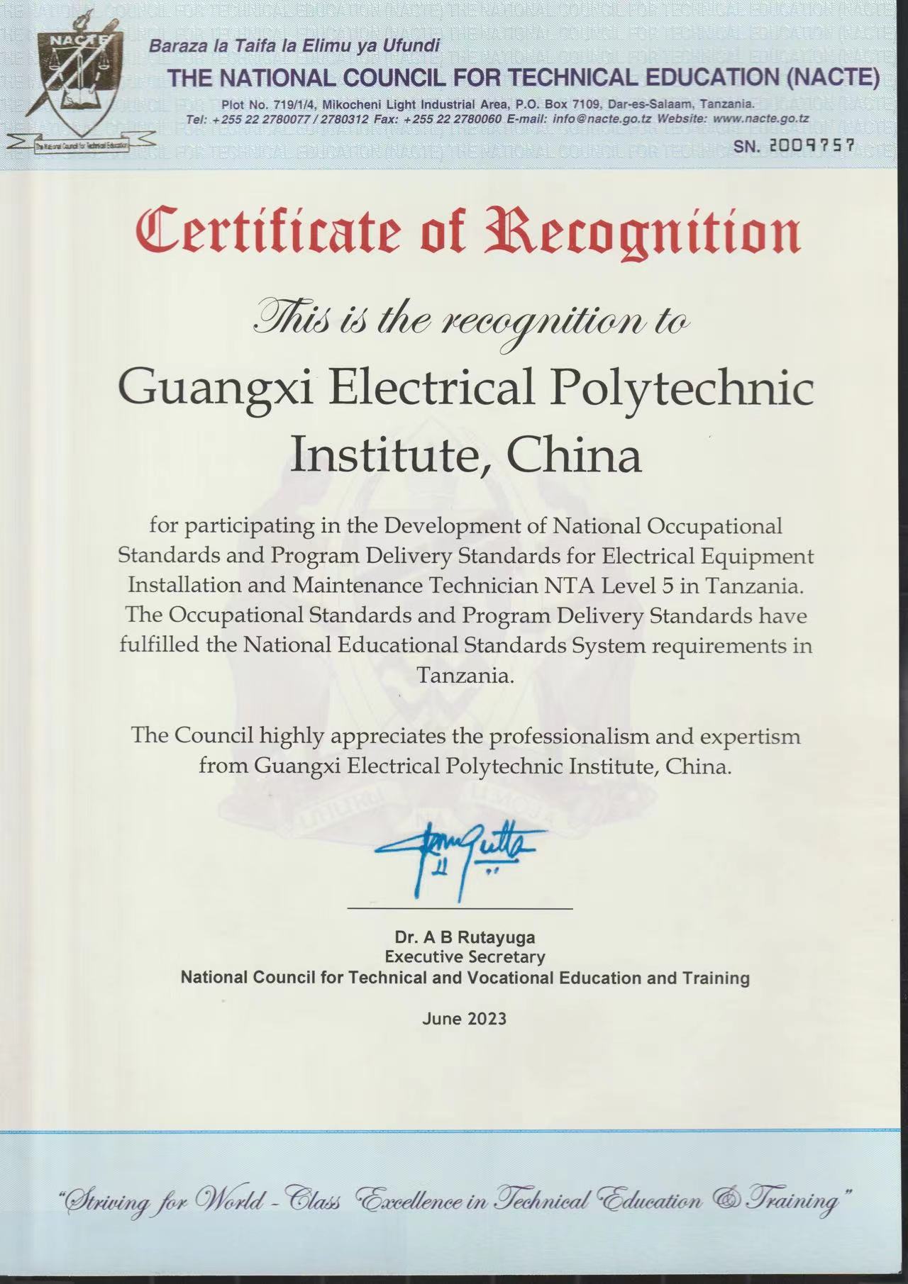学校组织建设电力设备安装与维修技术员4-6级共3项职业标准6月通过了坦桑尼亚国家职业教育委员会审核获得认证,正式纳入坦桑尼亚国家职业教育体系,表明学校的职业标准得到了国际认可,提升了学校专业影响力。