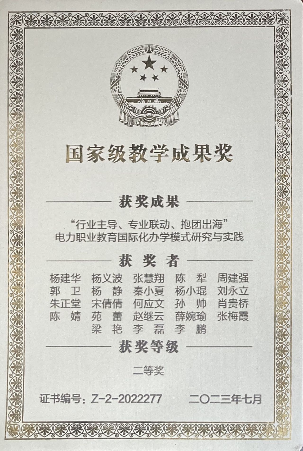 一是参与郑州电力高等专科学校为第一完成单位申报的《“行业主导、专业联动、抱团出海”电力职业教育国际化办学模式研究与实践》,荣获2022年国家级教学成果二等奖。