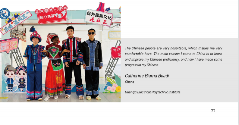 二是2022级国际学生包小林(Catherine Biama Boadi) 分享的活动感言和照片入选中国教育国际交流协会组织编写的2023年《留学中国指南》。