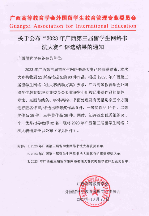 一是国际学生参加2023年广西第三届留学生网络书法大赛,荣获二等奖1项,三等奖4项。