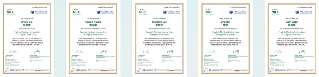 5-6月期间,5名教师参加EMI全英文授课教师能力提升项目,顺利结业并获得由中国教育国际交流协会颁发的EMI全英文授课教师能力提升项目的结业证书。