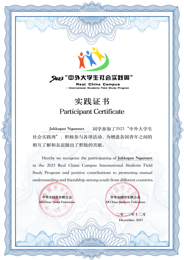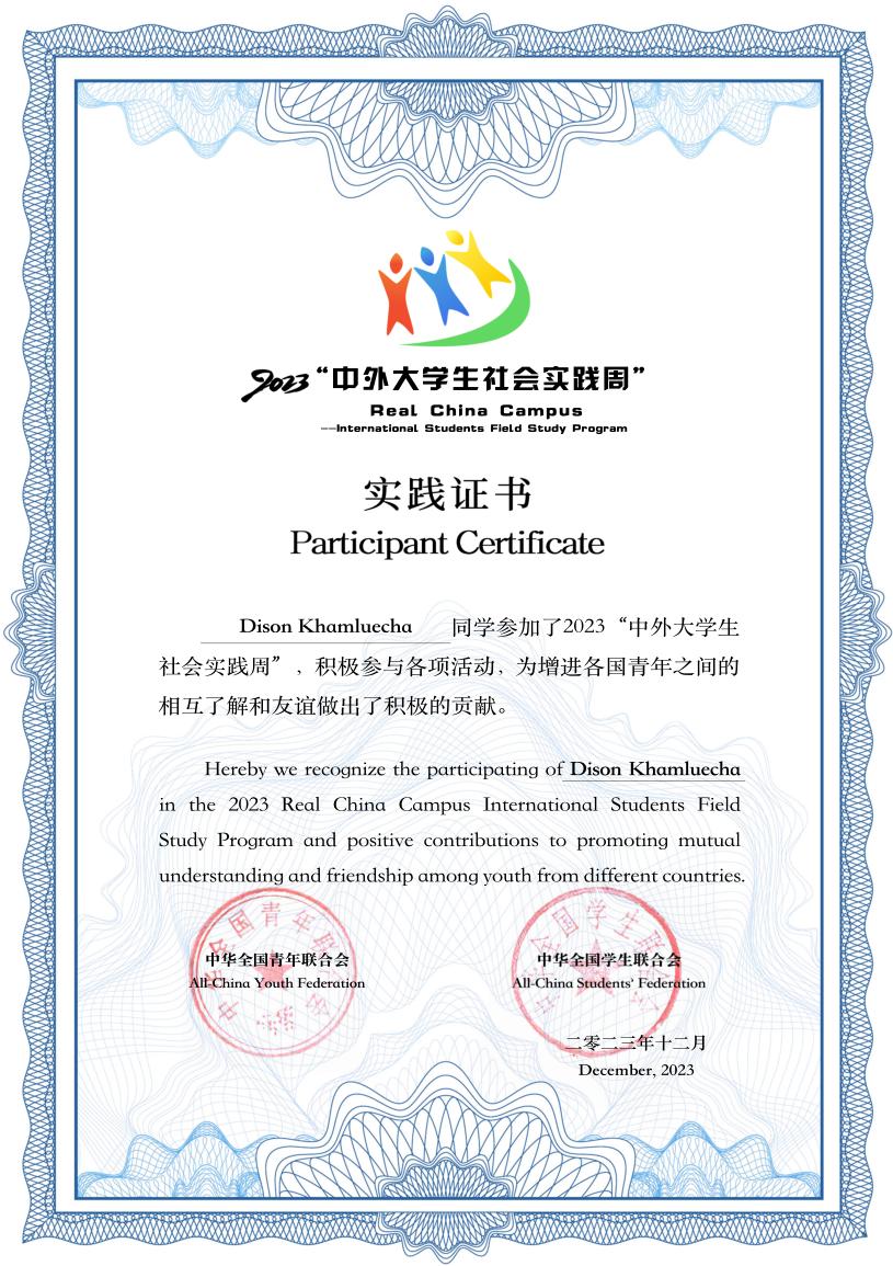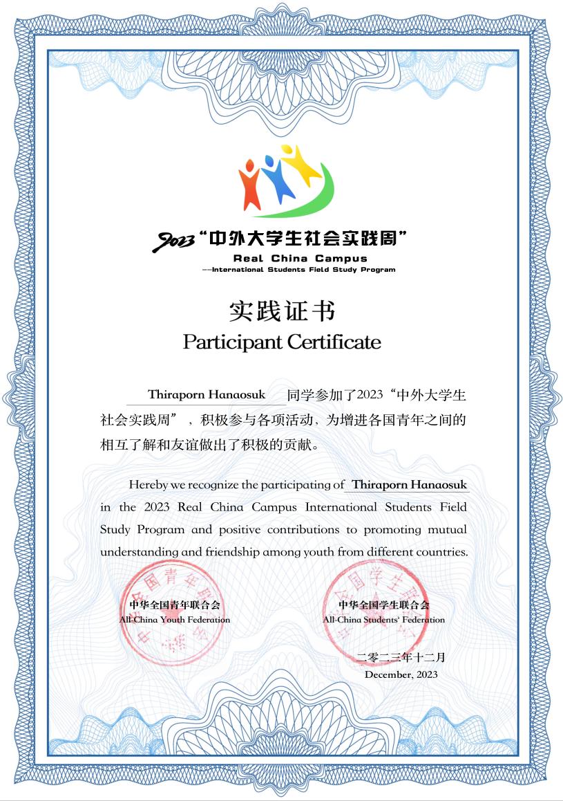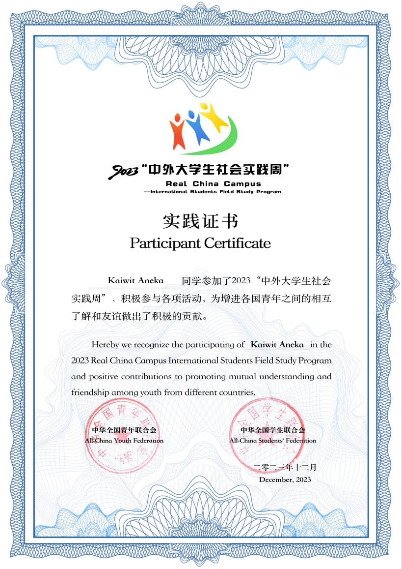 近日,我院国际学生在中华全国青年联合会、中华全国学生联合会主办的2023年“中外大学生社会实践周”活动中表现优异,获得全国青联、全国学联颁发的实践证书。