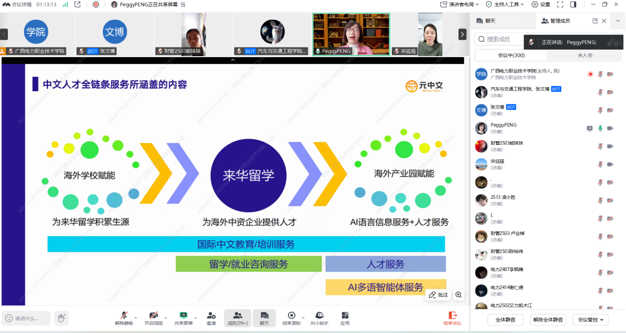 本次讲座聚焦国际中文教育市场动态与东南亚合作机遇,为师生搭建了了解中文国际化发展的交流平台。讲座采用线上直播形式,参与人员来自国际教育学院、电力工程学院教师以及学校2024级、2025级学生,参与师生约300人。