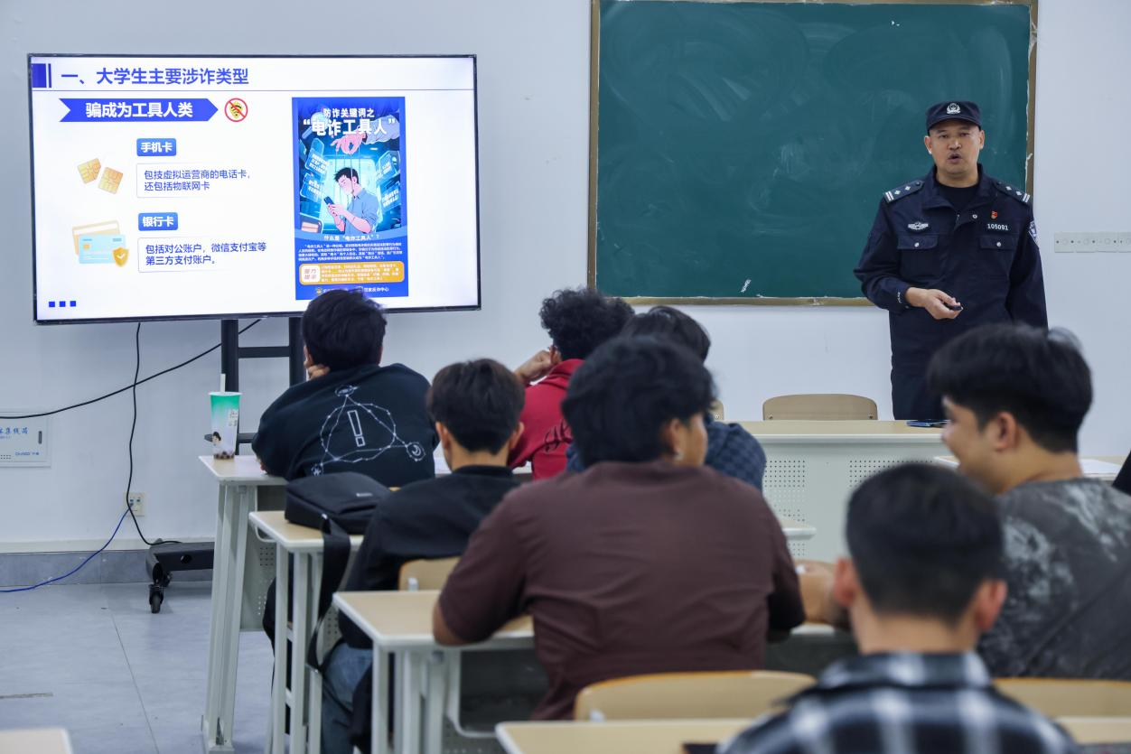 演习结束后,辖区派出所民警入校开展反诈防诈宣传。结合国际学生群体特点,民警以案例拆解、话术还原的方式,重点讲解刷单返利、虚假网贷、冒充客服退款等高发骗局,提醒学生警惕诈骗陷阱,守护自身财产安全。